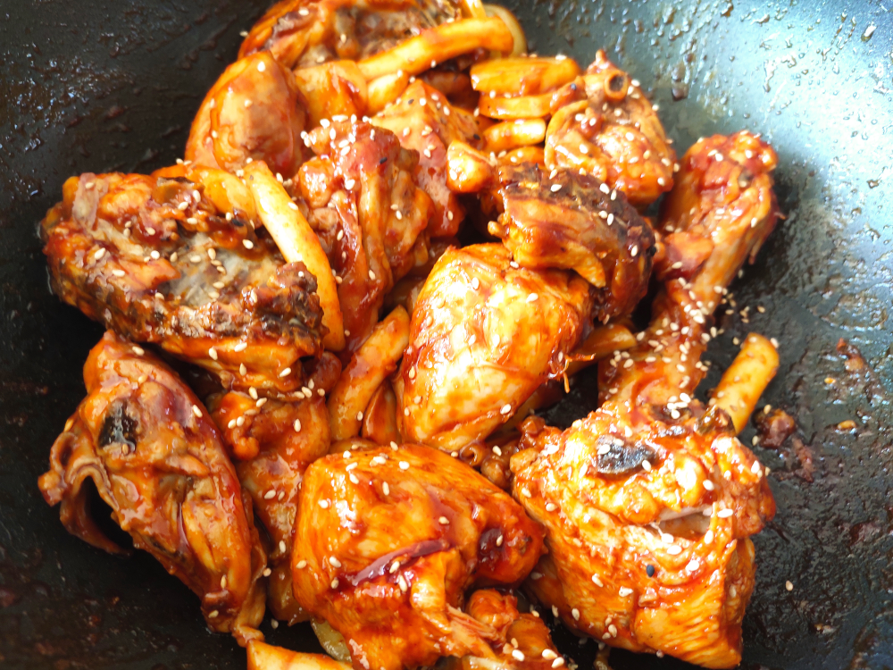 충분히 노릇노릇하게 조리되었으면 이때 떡을 치킨 위에 올려주고, 고추장 2 큰술, 간장 2 큰술, 설탕 1큰술 or 꿀 1큰술(또는 물엿)을 양념장으로 만들어 같이 넣어줍니다. 매운맛을 좋아하시면 기호에 따라 핫소스도 1~2 큰술 넣어주세요.