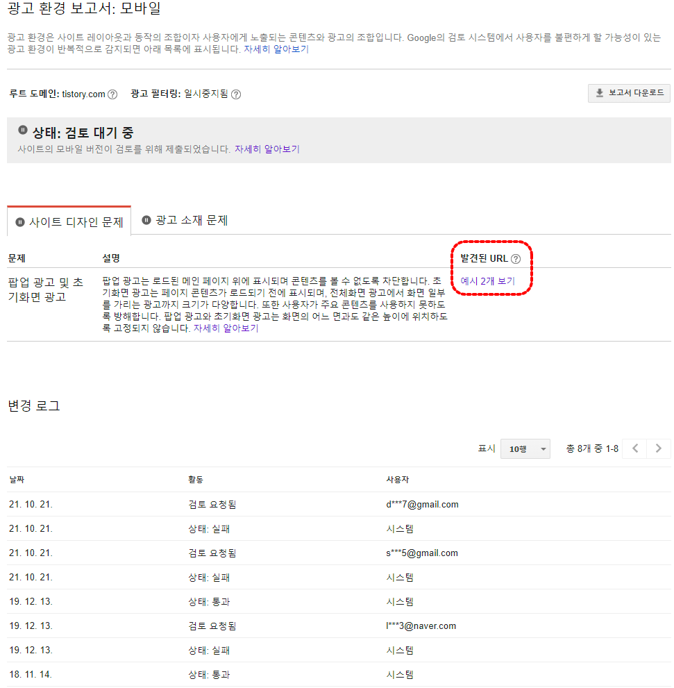 '발견된 URL'에 나오는 예시기 바로 위반한 URL인데요.