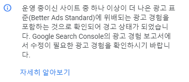 2021-10-21일 애드센스 상단에 "운영 중이신 사이트 중 하나 이상의 더 나은 광고 표준(Better Ads Standard)에 위배되는~~" 경고가 노출되었습니다.