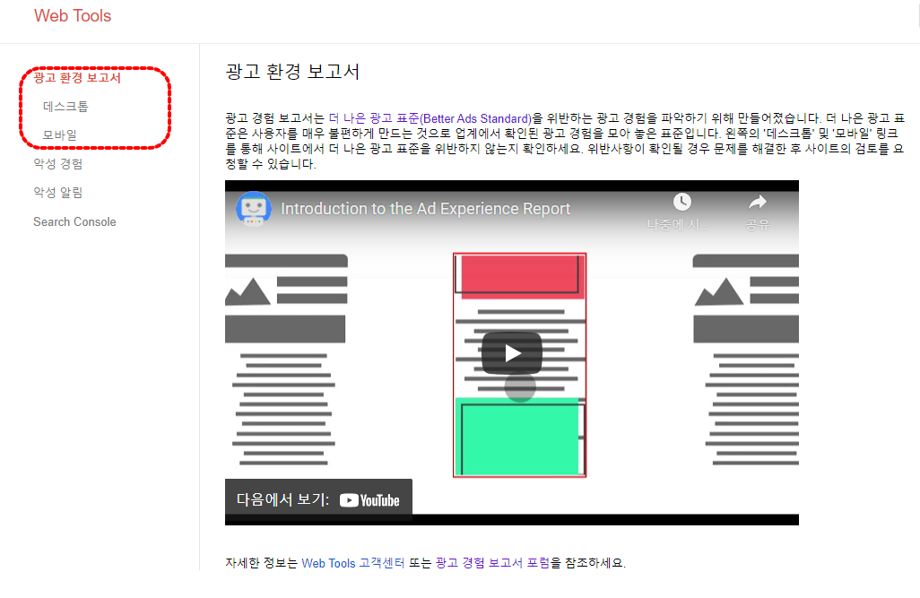 더 나은 광고 표준 위배 URL을 확인하기 위해서는 Google search console에 접속하여 '기존 도구 및 보고서 메뉴'에 있는 'Web Tools'를 사용하는 것입니다.