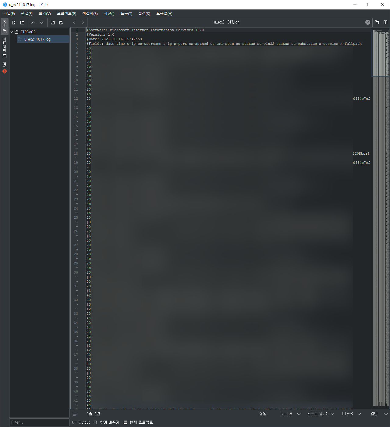 각종 log 파일이나 code의 경우 상당히 많은 lines이 있습니다. 그래서 스크롤바를 통해서 문서 내에서 이동을 하는데 Kate에서는 이 스크롤바 위치에 단순 스크롤바가 아닌 스크린샷 형태의 미니 탐색창 같은 것이 있습니다.