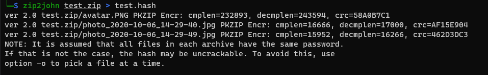 zip2john test.zip > test.hash 명령어를 사용하여 zip 파일에 저장된 hash 값을 test.hash 파일로 저장했습니다.