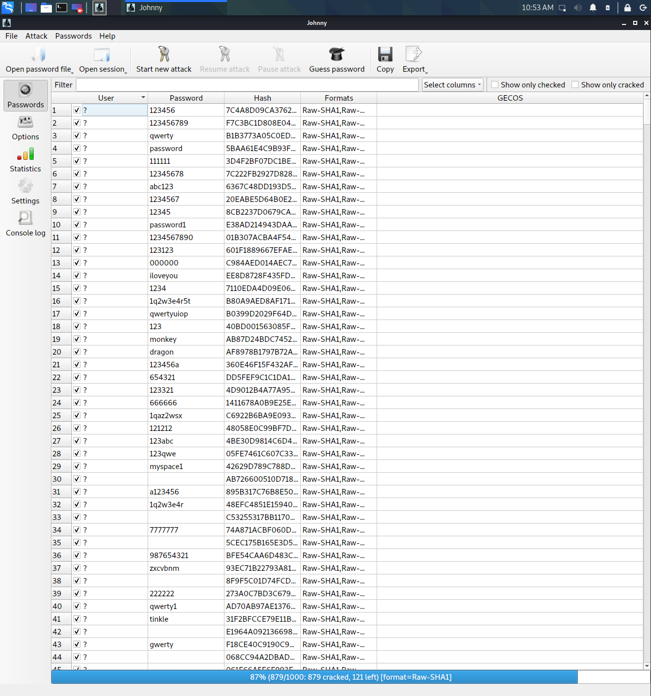 Johnny 프로그램을 사용해서 1000개 암호에 해당하는 hash 파일을 crack 해봤습니다. 기존에 크랙 했던 비밀번호가 있는 경우 프로그램으로 불러들이자마자 암호가 바로 나와버립니다. 1,000개 중에 879(약 87%)가 바로 풀려버렸네요.