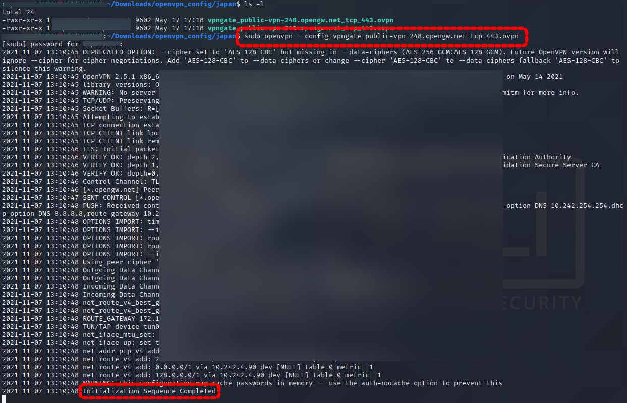 "Initialization Sequence Completed"라는 메시지가 나오면 VPN Server에 정상적으로 연결된 상태입니다.