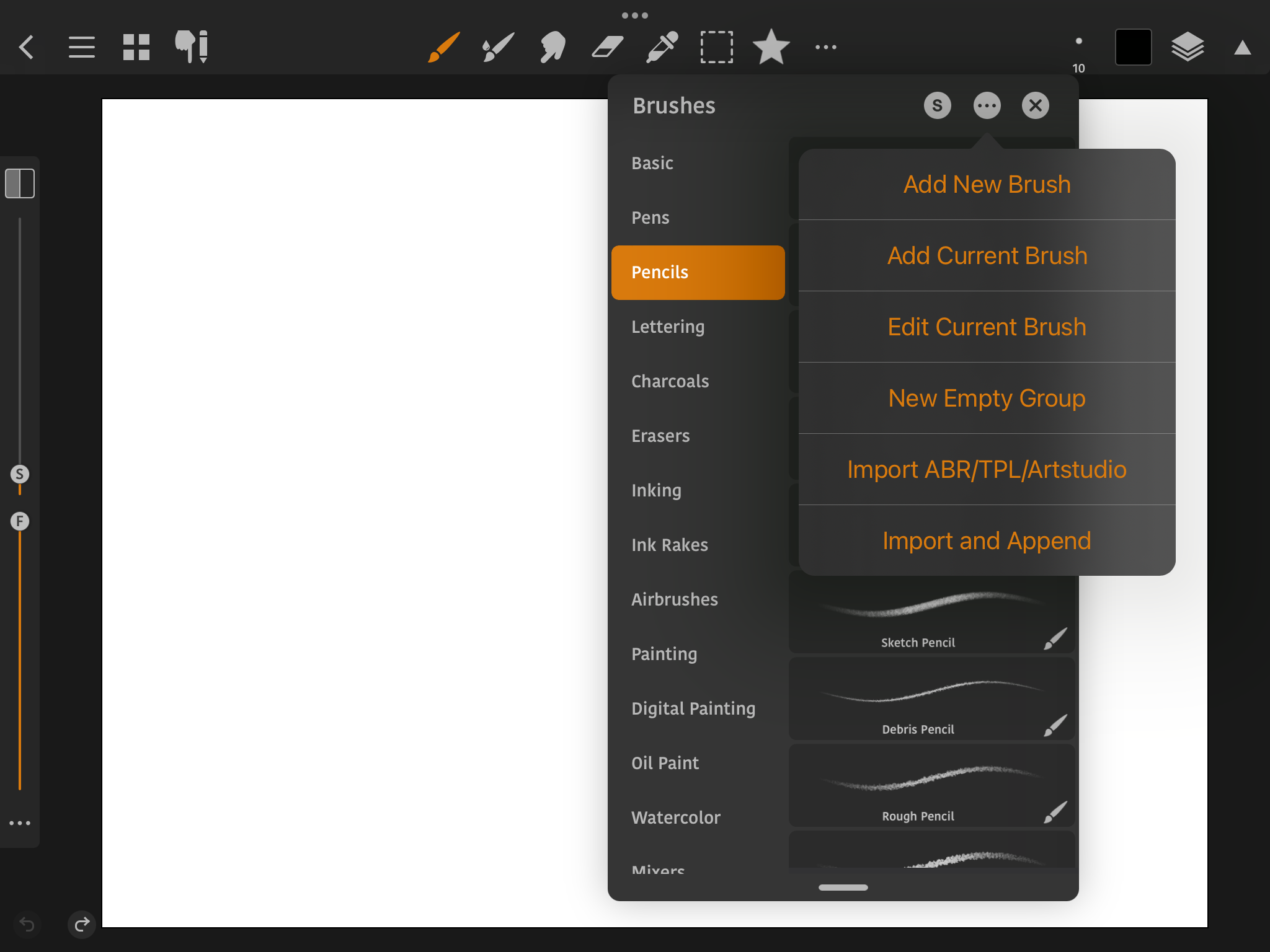 Brushes tool에서 '점 세 개' 아이콘을 누르면 Import ABR/TPL/Artstudio, Import and Append 메뉴를 통해서 외부 Brushes를 가져올 수 있습니다. 많이 사용되는 포맷 형식 ABR, TPL, PAT, GRD, ASE, ACO 모두 지원됩니다.