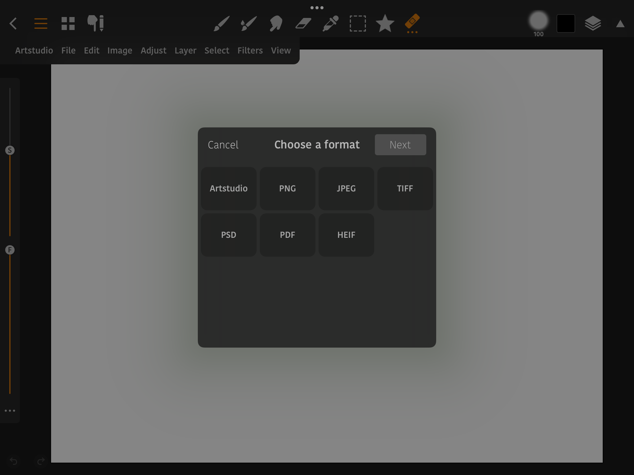 [Export] 메뉴에서는 Artstudio 뿐만 아니라 포토샵 PSD, PDF, HEIF, PNG, JPEG, TIFF 포맷으로 Export 가능합니다.
