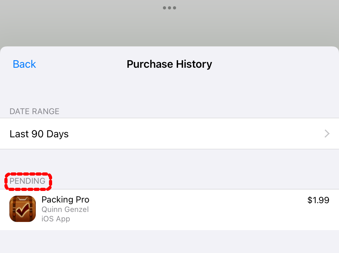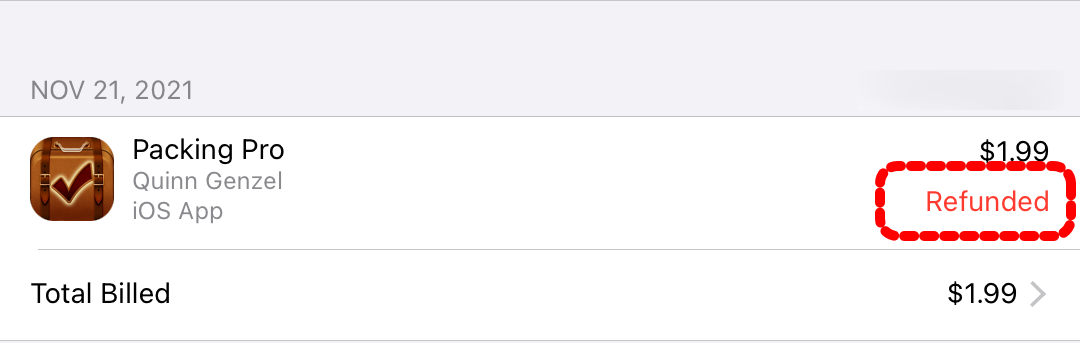 기존에는 'Pending' 상태였던 구매 앱의 금액 아래쪽에 'Refunded'라는 빨간색 상태 메시지가 보입니다.