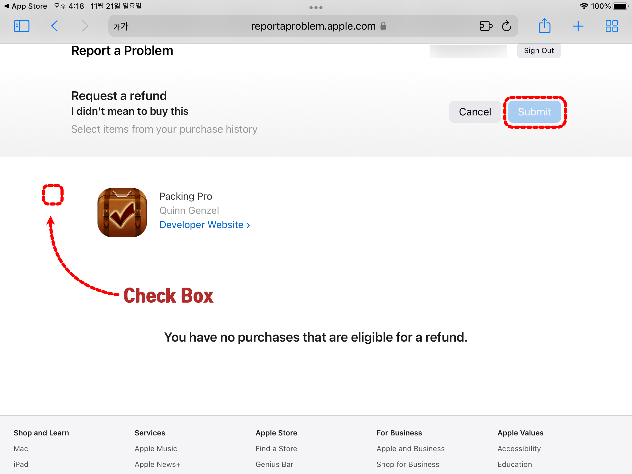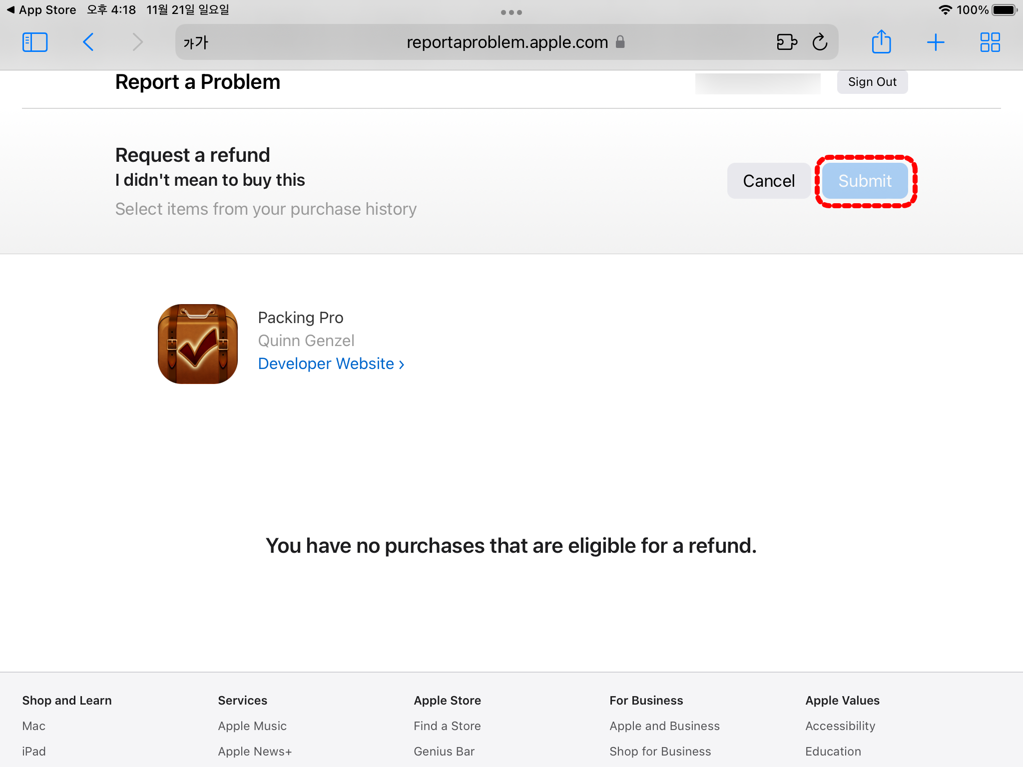 앱을 구매한 당일에 환불을 진행하면 위의 이미지처럼 '제출(Submit)' 버튼이 비활성화됩니다.