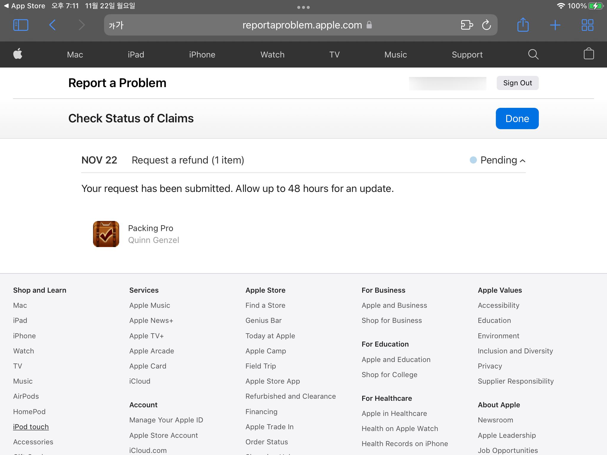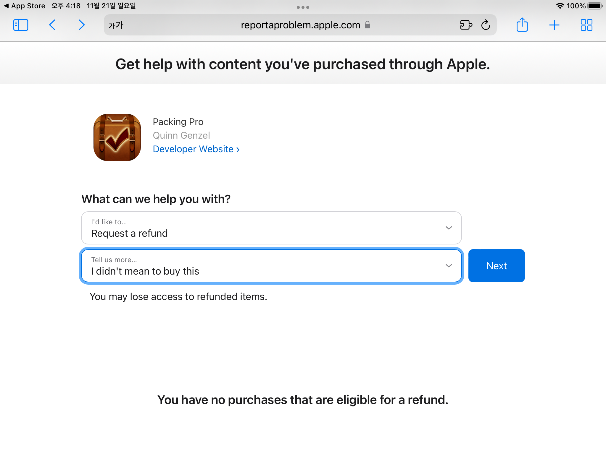 앱 구매 11월 21일, 환불 완료 11월 25일.