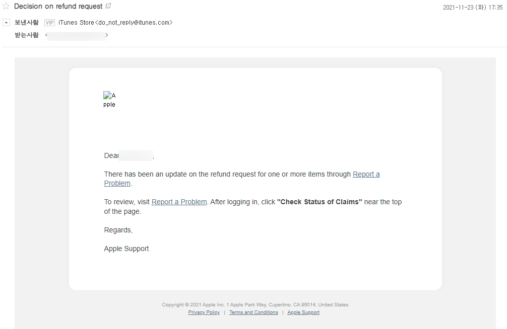 앱 스토어 가입에 사용된 E-mail로 정상적으로 환불 신청이 되었다는 통지 이메일이 발송됩니다.