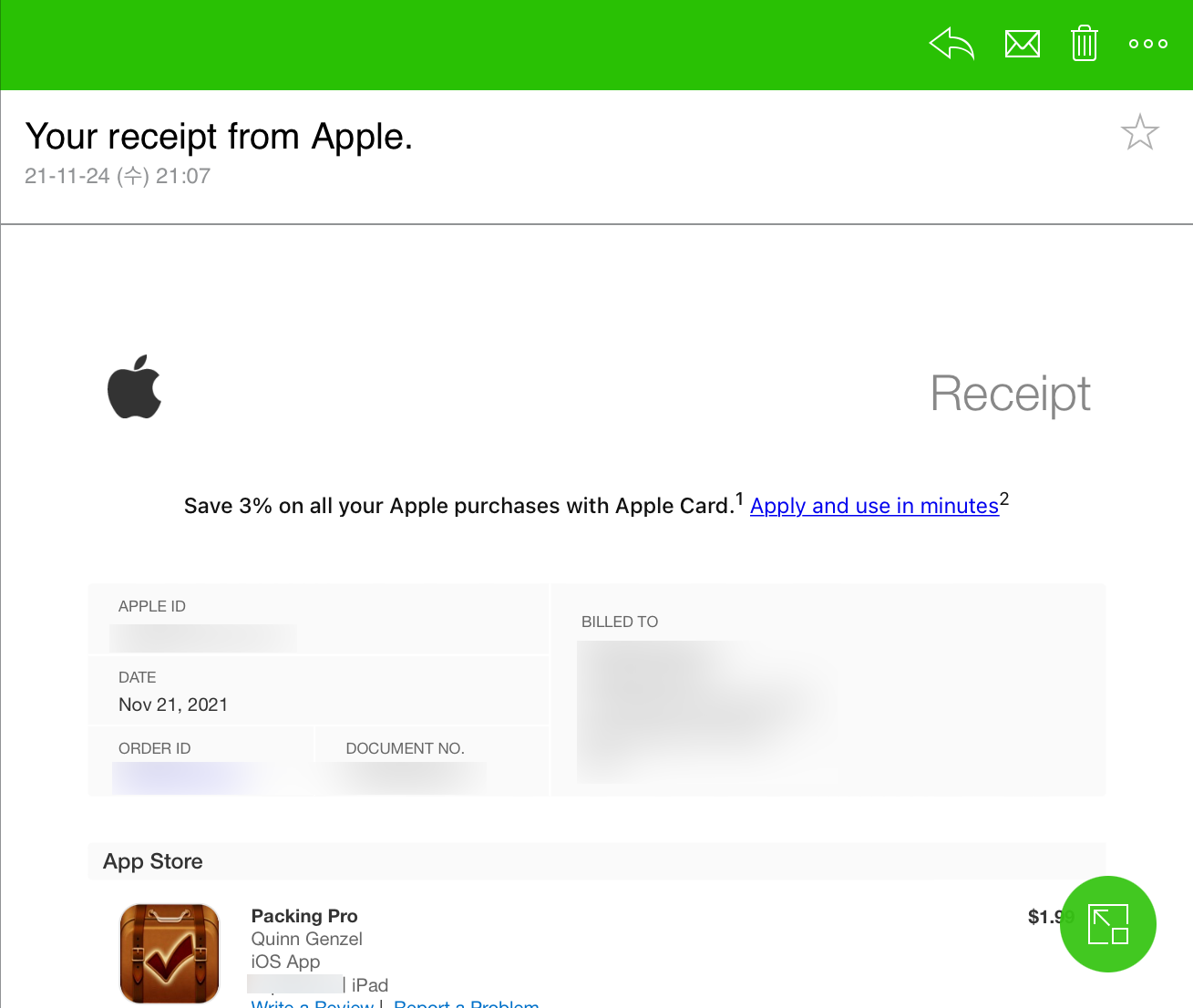 또 하루가 경과하고 갑자기 app 관련 영수증 이메일이 날라오네요.