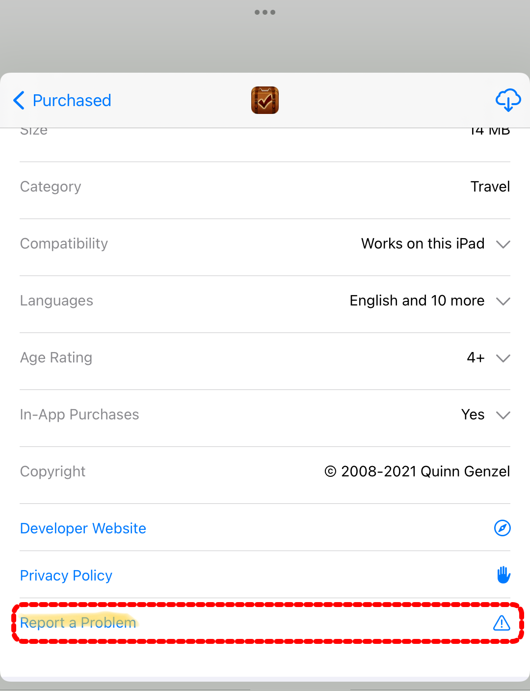 앱 설명 하단에 'Report a Problem' (문제 보고)라는 메뉴가 있습니다.