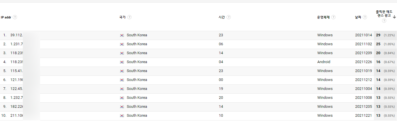 인터넷에 '애드센스 클릭 테러 IP', 'analytics ip' 추적과 같은 검색어로 검색하면 임의의 변수를 활용한 IP 맞춤 보고서 만드는 방법이 많이 나와있습니다.