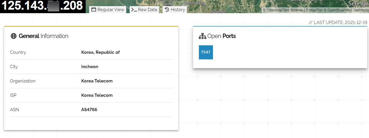 만약, 해당 IP에서 인터넷에 연결 및 외부 네트워크로 노출된 장비가 있다면 Shodan에서 자세한 결과가 나오게 됩니다.