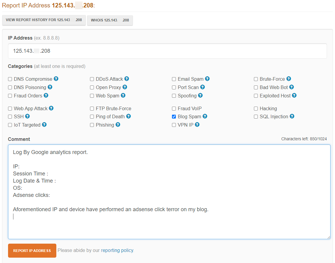 애드 센스 클릭 테러 카테고리가 별도로 없어서 저는 Blog Spam 카테고리에 신고를 하는데요, Comment에 간단하게 위와 같이 google analytics IP 맞춤 보고서에서 확보한 정보를 입력하고 REPORT IP ADDRESS 버튼을 누르면 신고가 완료됩니다.