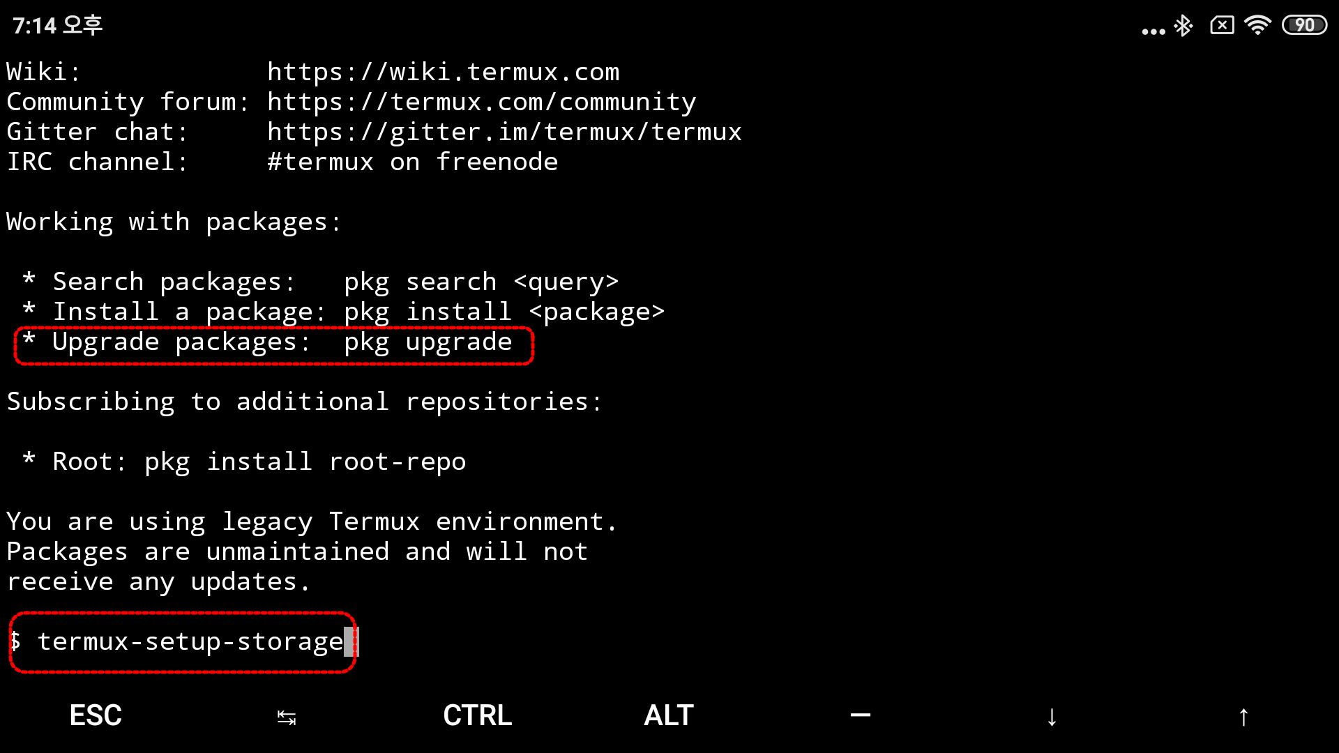 termux 앱을 실행하고 pkg update와 pkg upgrade 명령어를 각각 순서대로 입력 및 실행시켜 주세요.