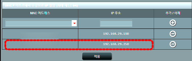 공유기 DHCP 서버 설정 부분에서 Android 공기계(NetHunter 설치)에 고정 IP를 할당해 줍니다.
