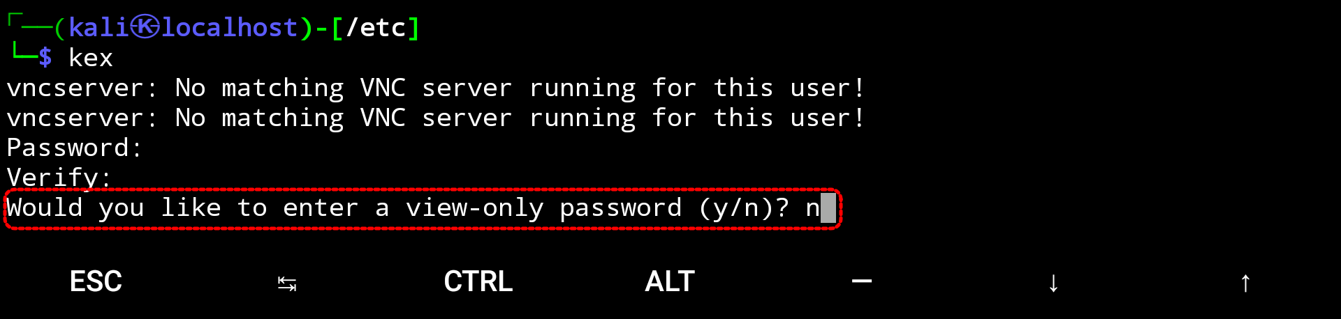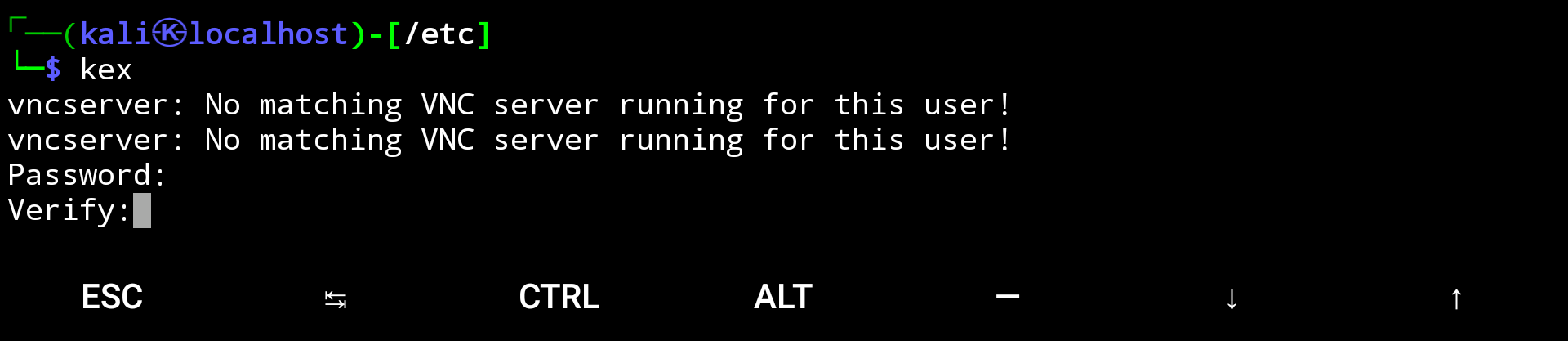 먼저, kex 명령어를 실행시키고 비밀번호를 설정해 줍니다. 여기에 입력하는 비밀번호는 vnc client를 통해서 접속할 때 입력하는 비밀번호입니다. kali 비밀번호와 다른 비밀번호를 사용해도 됩니다.