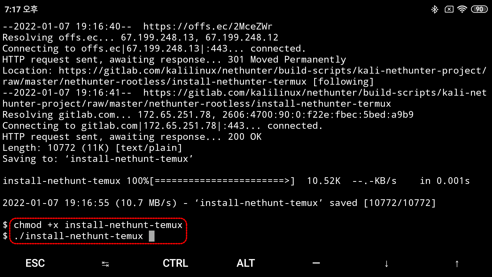 오타가 나서 install-nethunt-temux라고 입력했는데요. wget -O 옵션 자체가 뒤에 있는 https://offs.ec/2MceZwr을 을 다운받아 install-nethunt-temux라는 이름으로 저장시키는 명령이라 저장시킬 파일명에 조금 오타가 있어도 큰 문제는 없습니다. (오타를 피하기 위해서 kali linux rootless installation에 나오는 절차를 복사 & 붙여넣기 하세요)