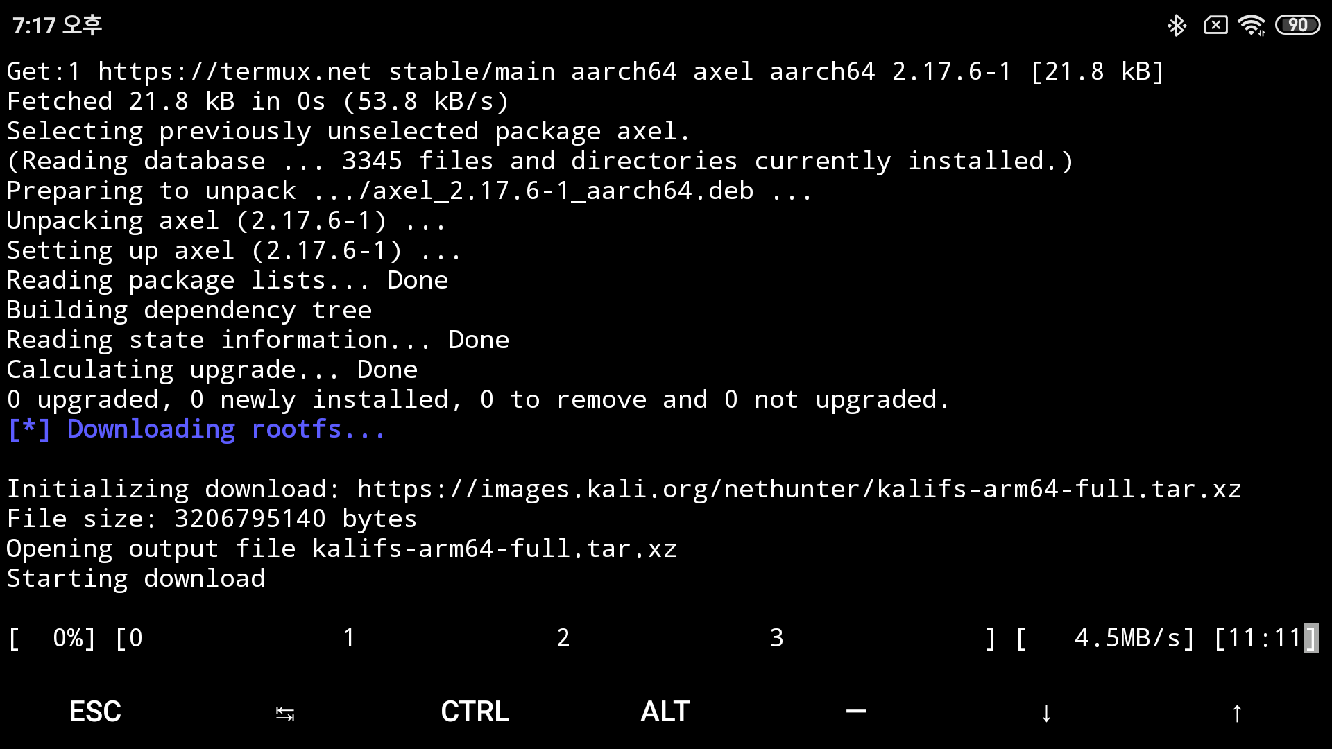 kali rootless installation 문서에 보면, 최초 NetHunter 설치 이후 sudo apt update && sudo apt full-upgrade -y를 실행시켜주라고 하던데요. update 및 upgrade 작업에는 약 5~6시간 소요됩니다.