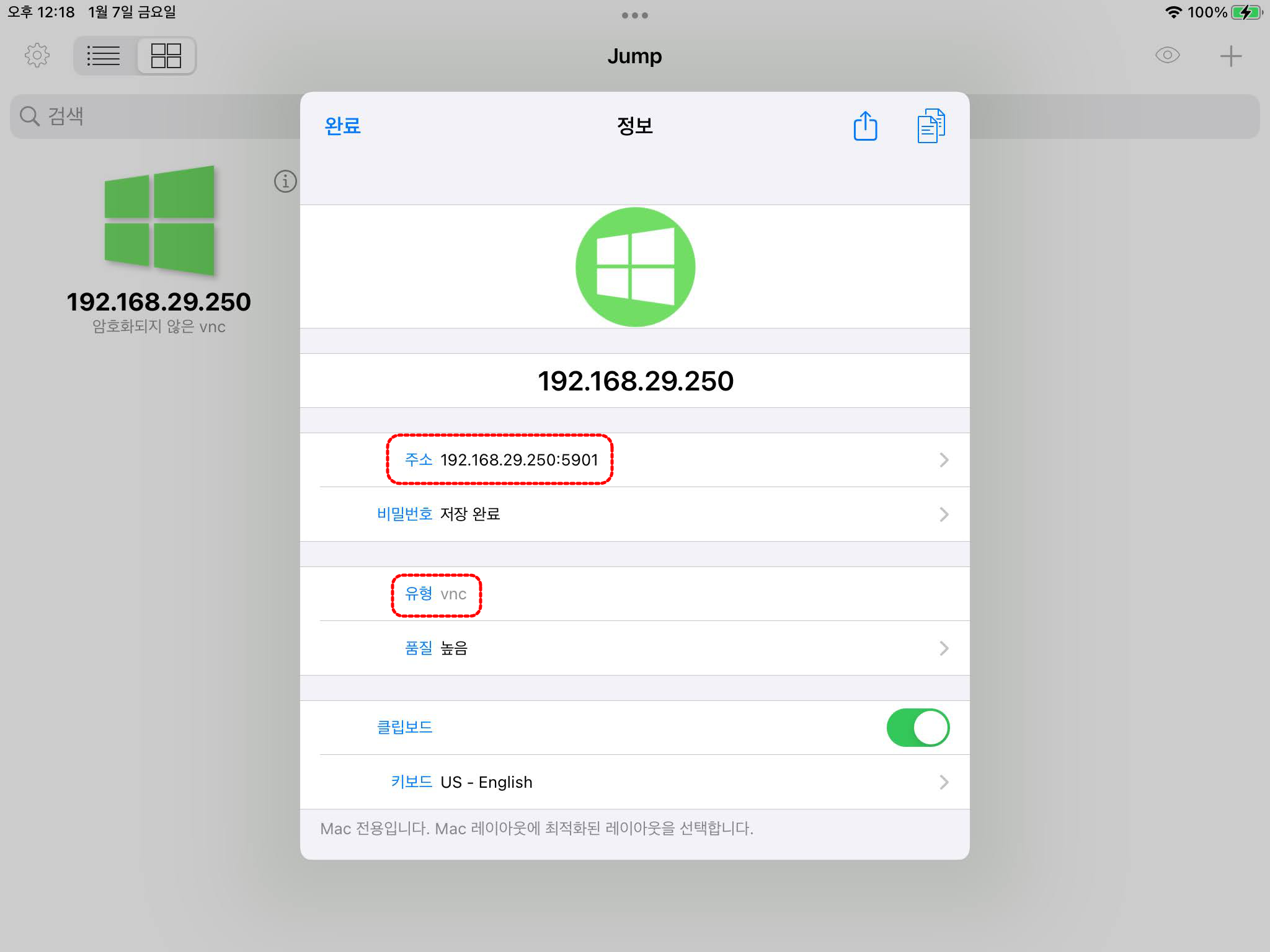 iPad Jump Desktop 앱은 RDP 및 VNC를 지원하는데요, 휴대폰 IP 및 PORT 5901, 그리고 유형은 vnc로 설정을 하고 연결을 시도합니다.