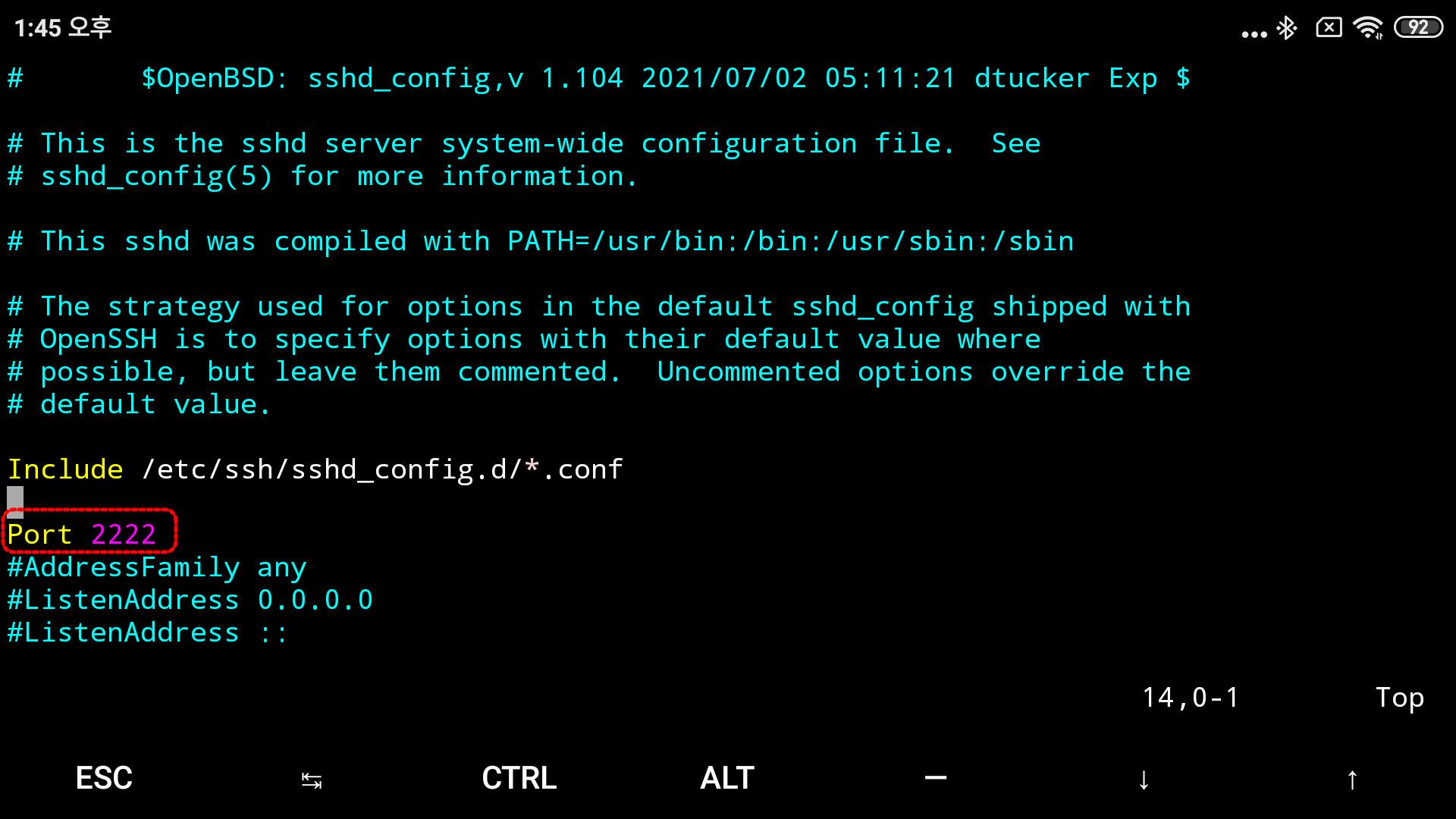 #Port 22 부분에서 #를 제거하고 22를 2222와 같이 수정합니다.