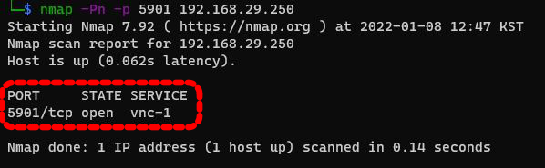 nmap에서 NetHunter IP 그리고 port 5901을 스캔했습니다. 정상적으로 State에 Open 으로 해당 포트가 열려있네요.