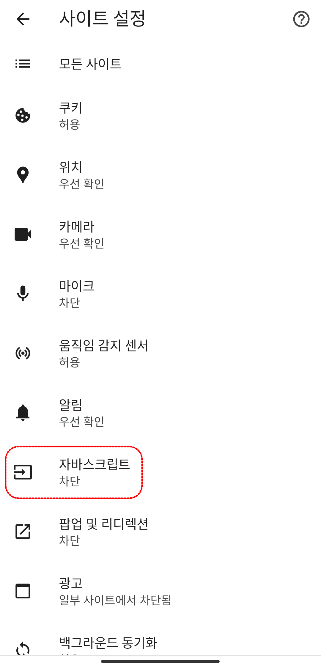 휴대폰 크롬 - 자바스크립트 차단 설정