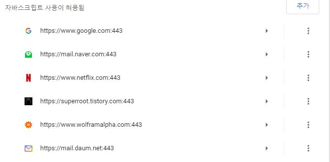 많은 사이트에서 자바스크립트를 사용하기 때문에 "다음", "네이버" 사이트에 접속하면 아무 화면도 못 보실 수 있어요. 사이트 마다 선택해서 예외적으로 "허용"시켜주시면 정상적인 사용이 가능한데 한 번 "허용"시켜주시면 다음 방문할 때 문제없이 접속이 가능하기 때문에 사용하는 사이트가 몇 개 안된다면 이 방법을 사용하시는 것이 안전합니다.