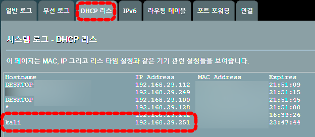 DHCP 리스 목록에 나오는 모든 장비에서 Kali Linux에 접속할 수 있습니다.