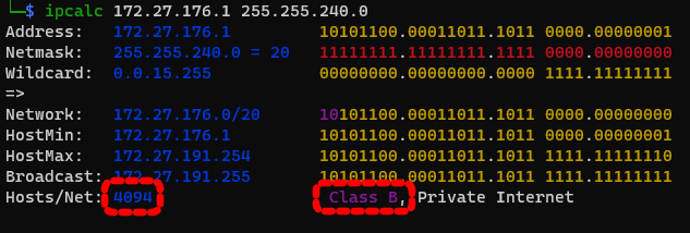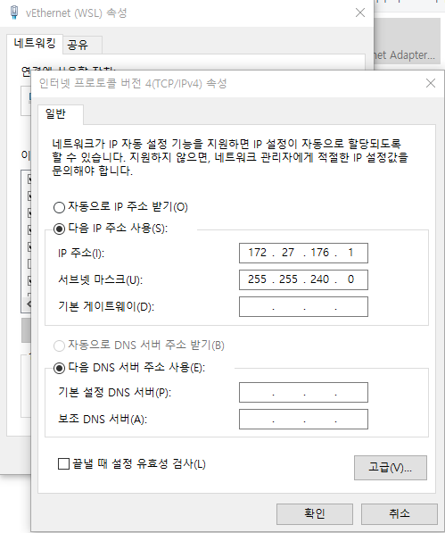 Windows 10의 WSL2, 어댑터를 살펴보면 서브넷 마스크가 255.255.240.0으로 구성되어 있어서 Class B로 지정되어 있습니다.