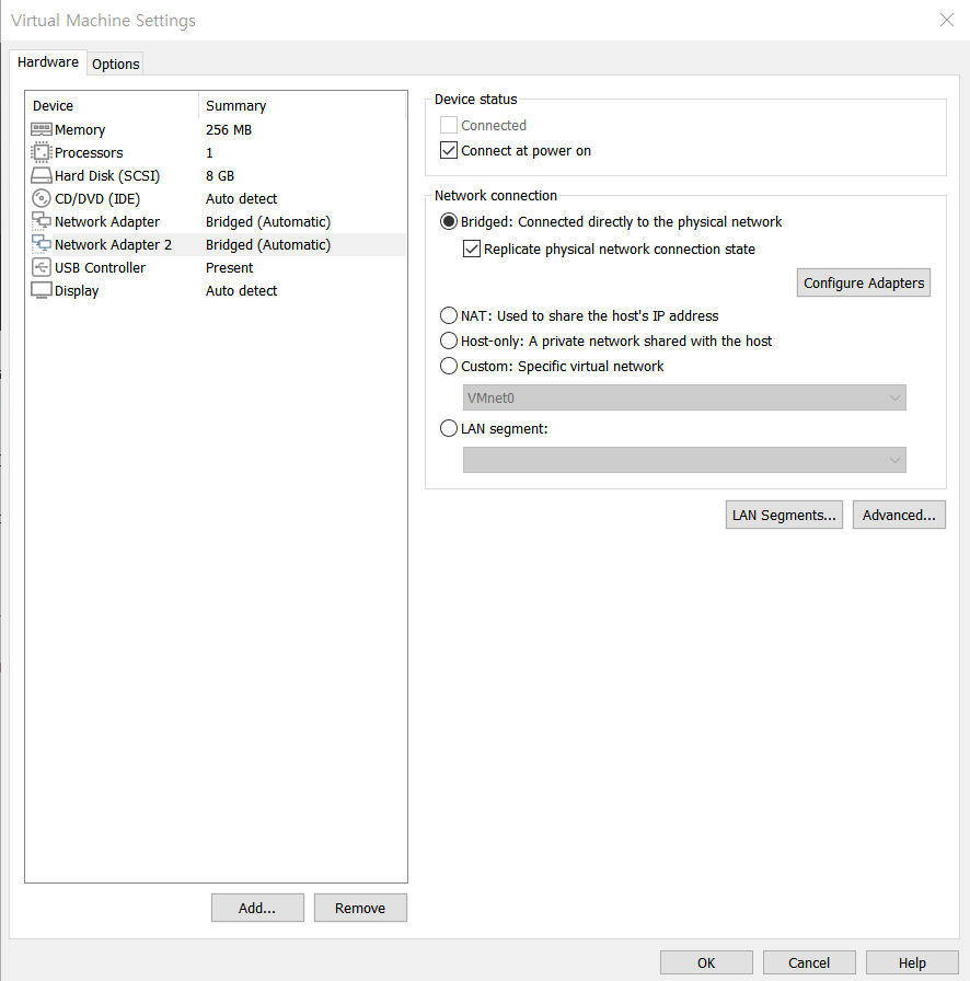 이 네트워크 어댑터를 그대로 사용하게 되면, Metasploitable2 가상머신을 설치한 컴퓨터에서 만 접근이 가능하게 됩니다. 가정 내 여러 장비에서 접근이 가능하게 만드시려면 (첫 번째 Network adapter만)Bridged Network Adapter로 바꿔주셔야 합니다.