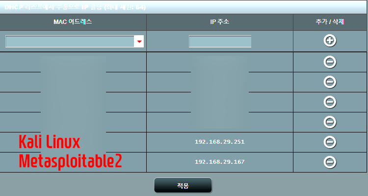 가상머신 부팅할 때마다 IP를 고정시켜서 사용하고 싶다면, 무선공유기 DHCP 서버 메뉴에서 Metasploitable2의 eth0의 Mac address와 IP 주소를 수동으로 IP 할당해주시면 항상 설정한 IP로 고정시킬 수 있습니다.