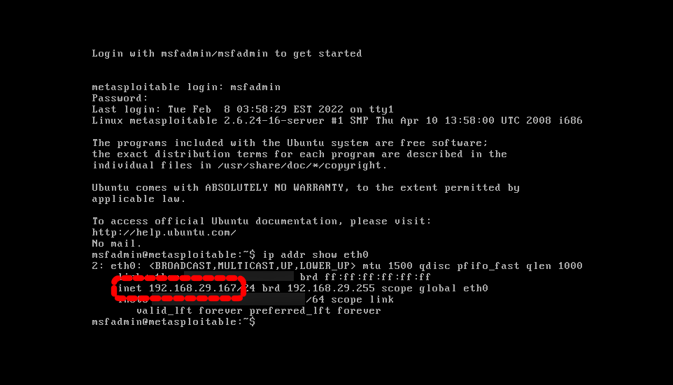 Metasploitable2 가상머신을 구동시키고 할당된 IP를 확인해 보면 아래 사진처럼 무선공유기 DHCP에서 IP가 잘 할당 됨을 알 수 있습니다.