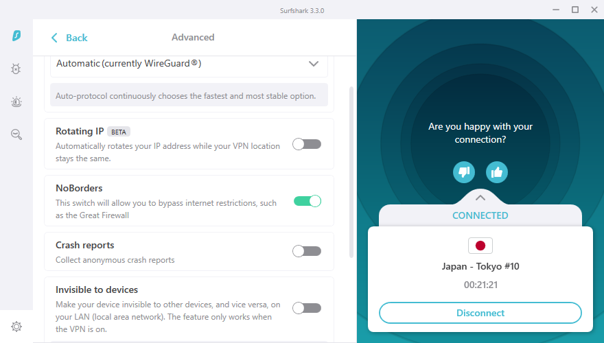 Surfshark VPN의 Windows client 프로그램입니다. 아주 심플한 인터페이스로 이뤄져 있습니다. 원하는 국가의 서버 번호를 선택하면 자동으로 연결됩니다. 연결이 되면 상태가 "CONNECTED"로 바뀌며 시간이 카운팅 됩니다.