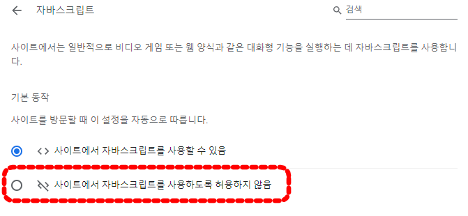 자바스크립트 허용, 차단은 설정 - 보안 및 개인 정보 보호 - 사이트 설정 - 자바스크립트 메뉴에서 변경할 수 있습니다.