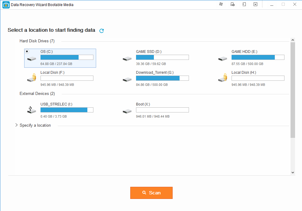 삭제된 파일이 있는 드라이브를 선택하고 "Scan" 버튼을 누릅니다.