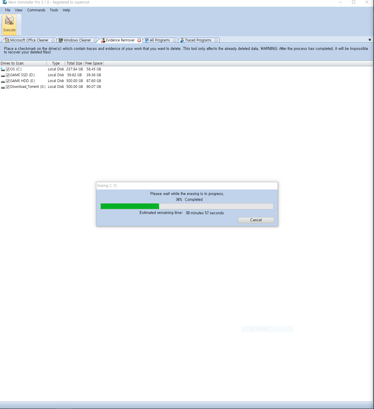 Evidence Remover는 드라이브에 있는 파일들에는 영향이 없이 삭제된 파일만 복구 불가능한 상태로 바꿔줍니다.