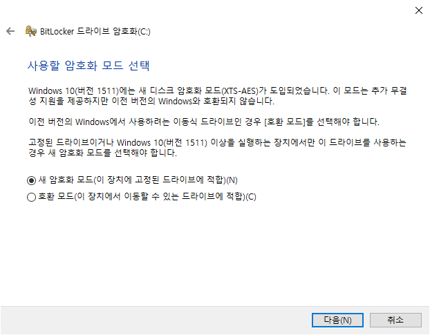 새 암호화 모드는 윈도 10 버전에서만 사용하는 경우, 호환 모드는 Windows 10 이하의 버전에서도 사용하는 경우 선택하는데, 운영체제는 이동식 드라이브처럼 다른 장비에 연결하지 않기 때문에 그냥 "새 암호화 모드"로 진행하시면 되겠습니다.