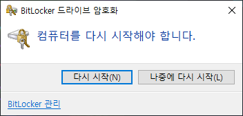 암호화 진행중에 powershell에서 몇 가지 명령어를 입력하다가 컴퓨터가 완전 멈추는 경우가 있었는데요, 컴퓨터 재부팅을 하니 다행히도 암호화가 다시 진행되더군요.