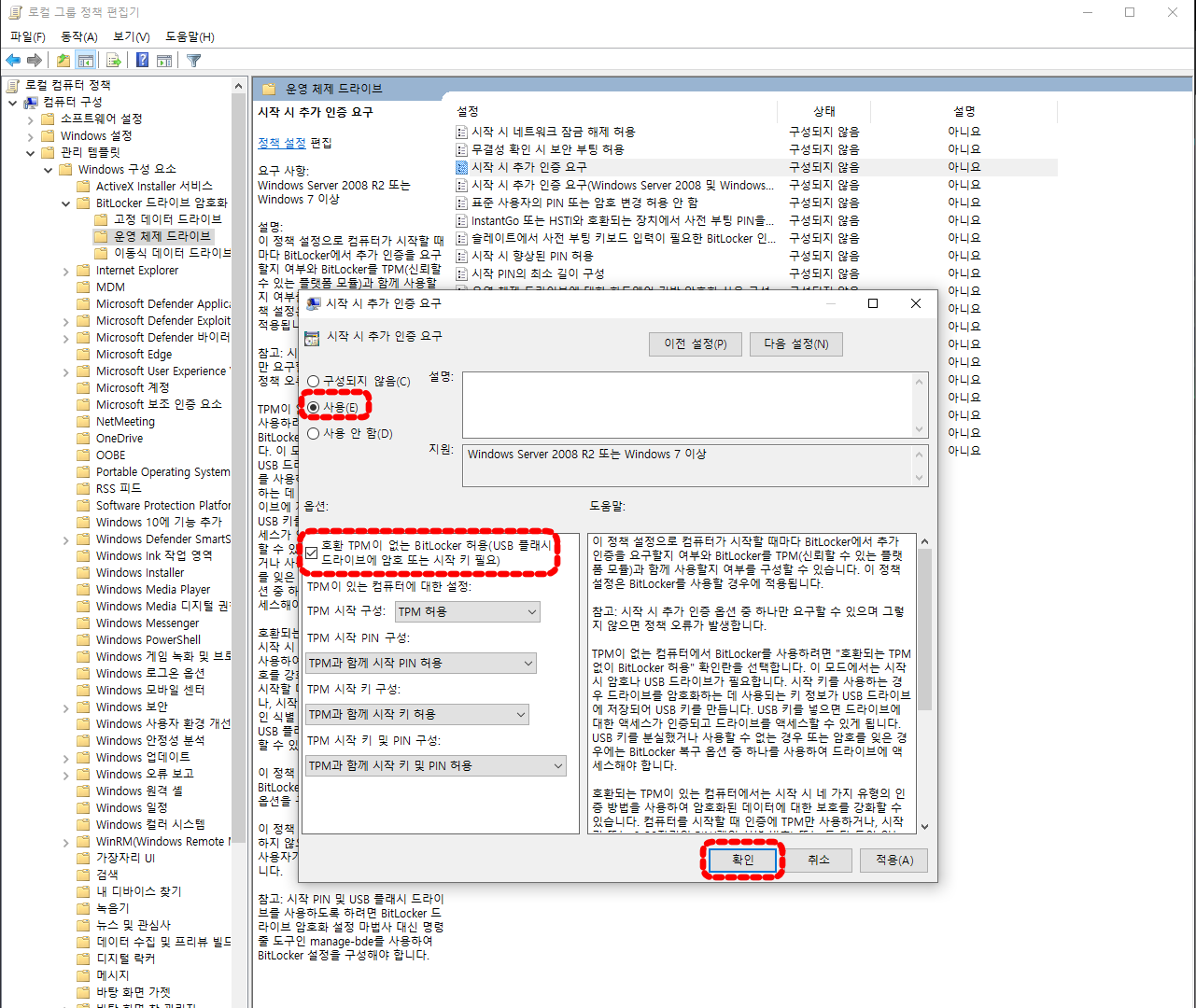 BitLocekr 켜기를 위한 정책 설정 (TPM 없는 메인보드)