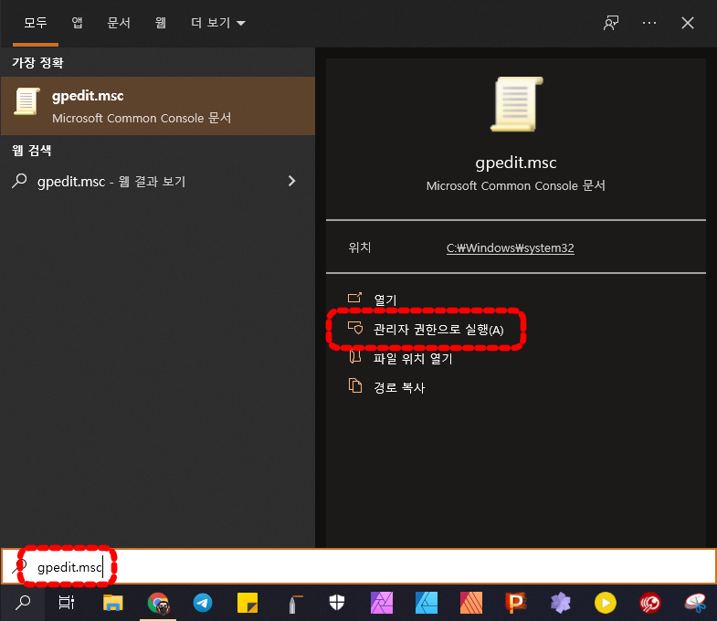 먼저 "로컬 그룹 정책 편집기"를 관리자 권한으로 실행해 주세요.