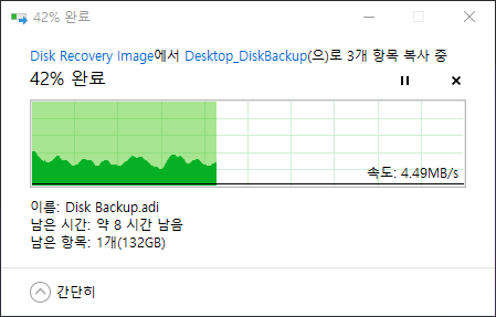 백업용 4TB HDD(USB 3.0, BitLocker Encrypted)에 디스크 백업 이미지(231GB)를 백업해 봤습니다. 전송 속도가 50 MB/s에서 갑자기 5 MB/s로 떨어지면서 231GB를 전송하는데 약 3~4시간 걸린 것 같네요.