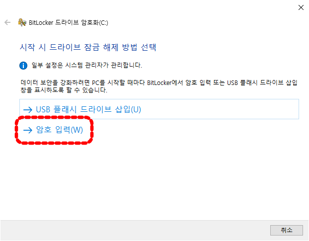 USB 플래시 드라이브 삽입 또는 암호 입력에서 하나를 선택합니다. USB 플래시 드라이브 삽입 방식을 선택하시면 KEY가 USB에 저장되기 때문에 항상 그 USB를 컴퓨터에 꽂아 둔 상태에서 부팅을 해야 합니다.