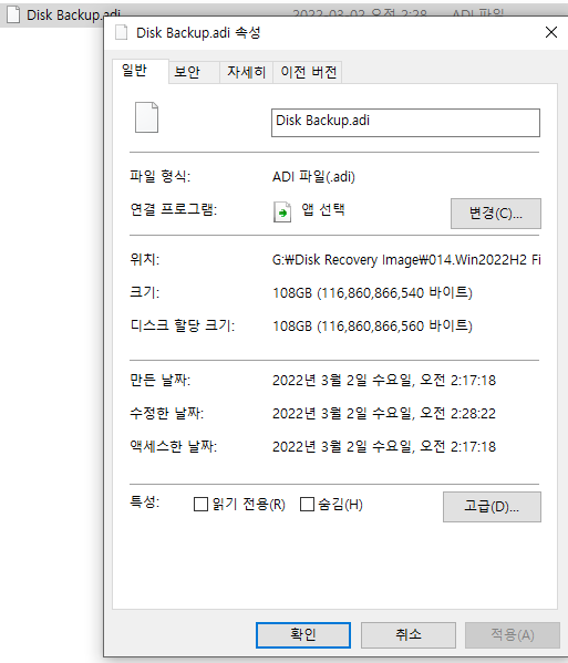 또한 디스크 복구 이미지를 생성하는 경우 BitLocker로 암호화된 디스크의 경우 이미지의 용량이 실제 HDD, SSD의 용량과 비슷하게 생성됩니다.