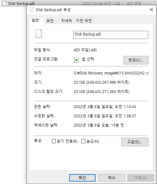 BitLocker 암호화되지 않은 운영체제의 경우 108GB 지만, BitLocker 암호화 시킨 운영체제의 디스크 복구 이미지의 경우 231GB의 용량을 차지하게 됩니다.