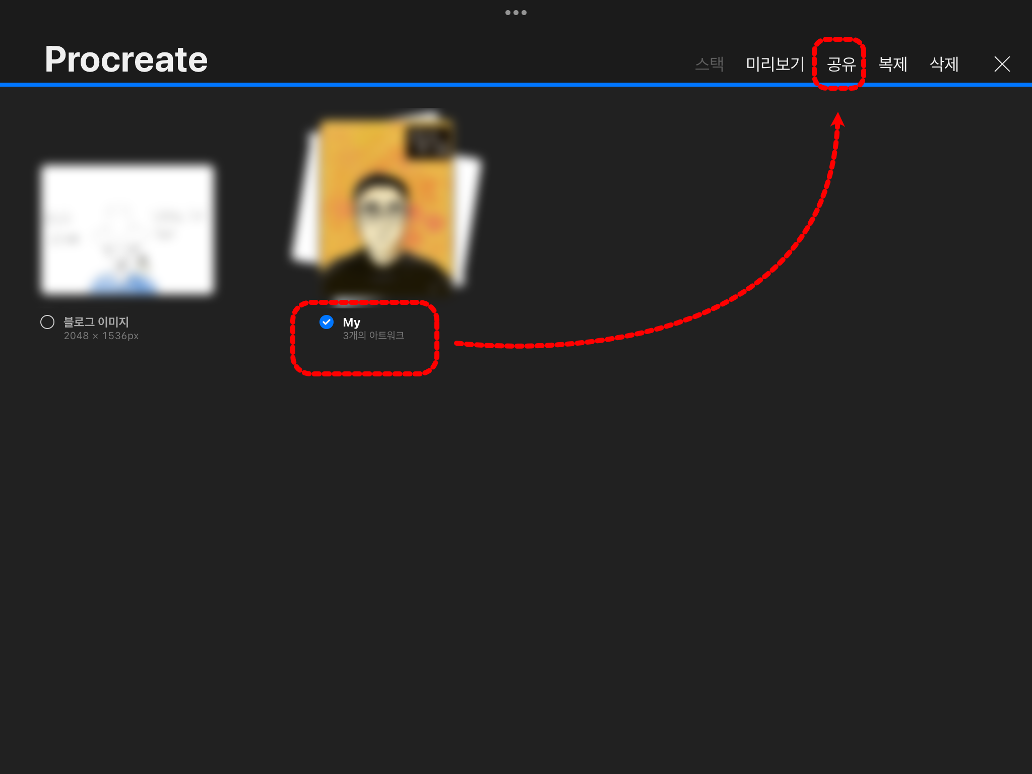 "선택"을 누르고 백업할 아트 워크나 스택을 선택하고 "공유"를 눌러 줍니다.