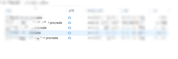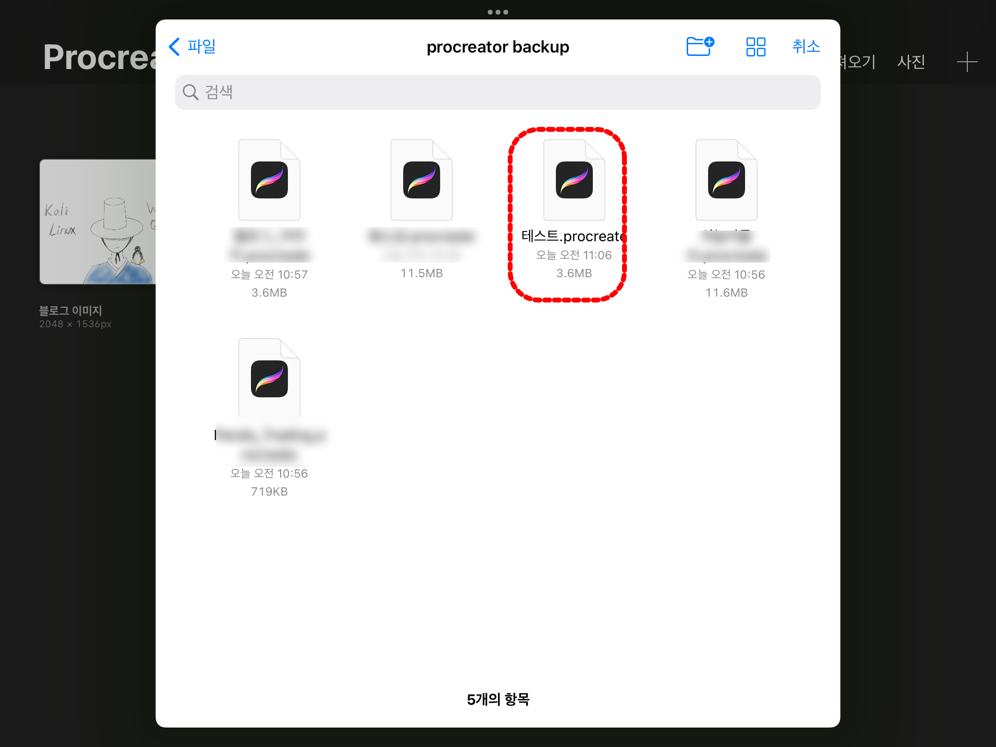 복원하는 방법을 알려드리기 위해서, 파일 중 하나를 복사하고 이름을 테스트.procreate로 변경했습니다.
