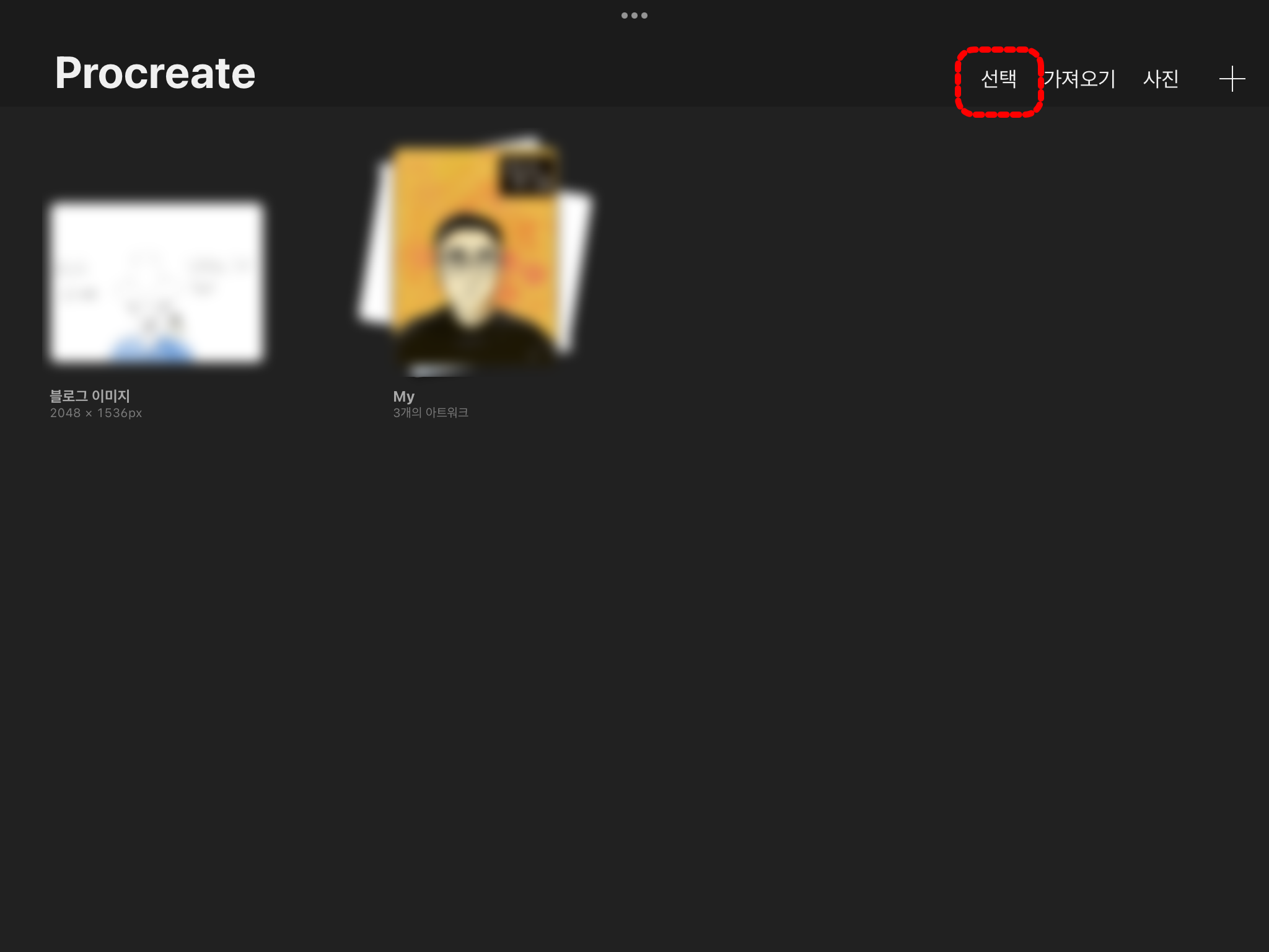 Procreate 백업을 위해서는 먼저 "선택" 메뉴를 눌러서 백업하려는 아트워크 파일 또는 스택(폴더)를 선택하시고 Dropbox, Onedrive, Box, Mybox와 같은 cloud로 직접 백업을 해주셔야 합니다.