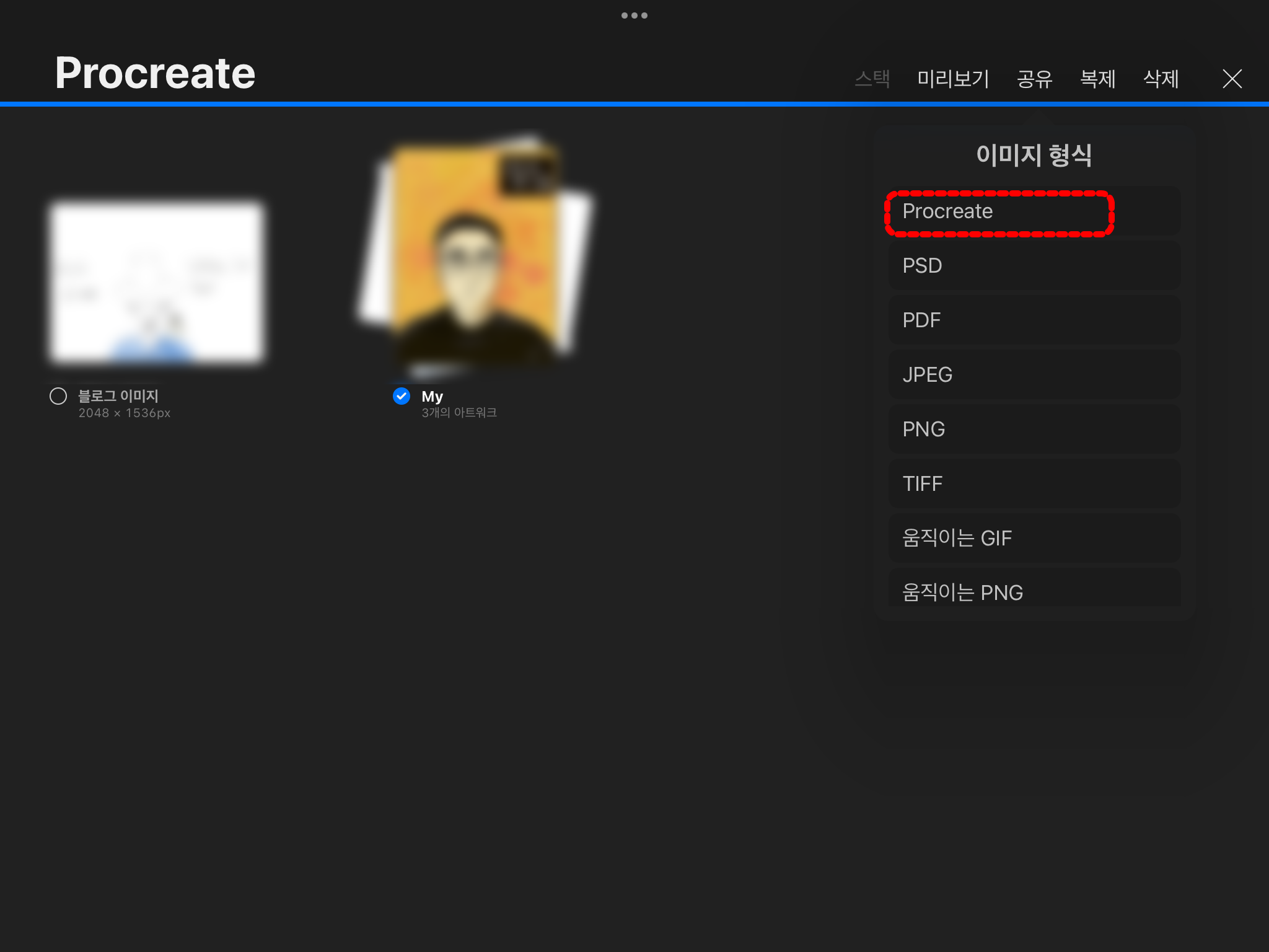이미지 형식에서 "Procreate" 포맷 형식을 선택합니다.